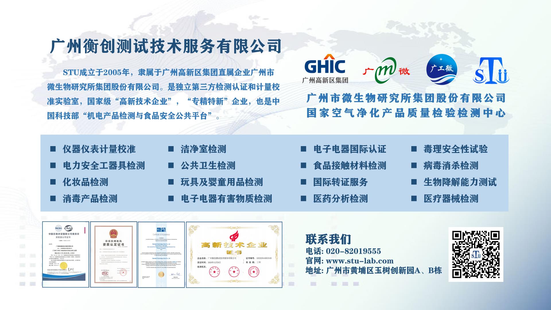 STU成立于2005年,隸屬于廣州高新區(qū)集團(tuán)直屬企業(yè)廣州市微生物研究所集團(tuán)股份有限公司。是獨(dú)立第三方檢測認(rèn)證和計(jì)量校準(zhǔn)實(shí)驗(yàn)室,國家級“高新技術(shù)企業(yè)”,也是中國科技部“機(jī)電產(chǎn)品檢測與食品安全公共平臺”。